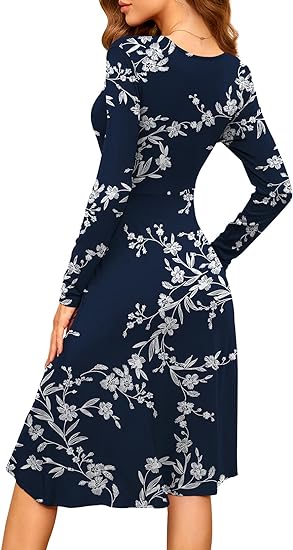 【Features】 Long sleeve dress, wrap v neck, a-line, floral patterned, fall dresses with pockets, casual swing dress, pleated flowy dress, knee length dress, empire waist dress
