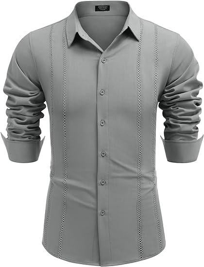 Cuban Guayabera Design --- Mens guayabera shirts features long sleeve, spread collar, button closure, cutout embroidery, relaxed fit. Distinct cuban design makes this shirt more fashionable and classic.