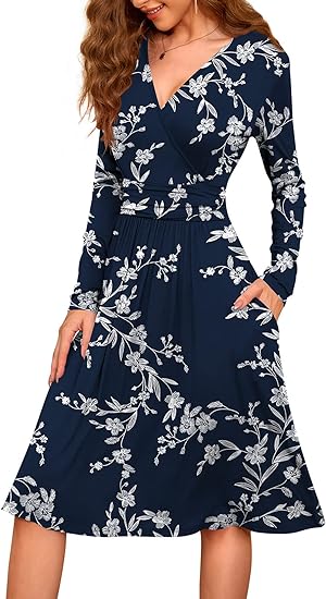 【Features】 Long sleeve dress, wrap v neck, a-line, floral patterned, fall dresses with pockets, casual swing dress, pleated flowy dress, knee length dress, empire waist dress
